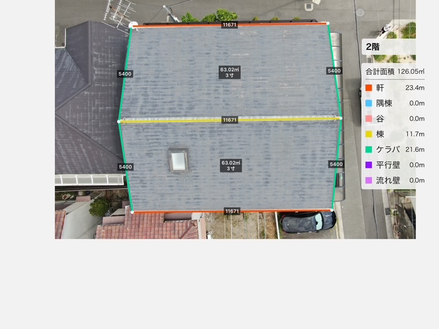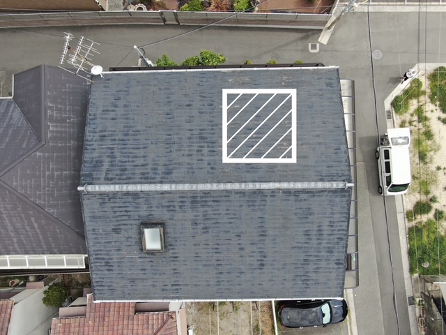 今回は塗装屋からの依頼でドローンで屋根の点検です。 屋根材を傷めずに点検出来て、墜落の危険性がないので安全です。心配な方は点検費用も15.000円位で出来ますのでご連絡下さい。 屋根材のカラーベストが大分風化しています。 このままだとボロボロになって雨漏りの原因になります。 外壁や屋根の面積も同時に積算する事ができます。 今回は塗装屋からの依頼でした。